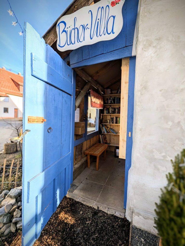 Was bis 2024 ein mit Efeu überrankter vernagelter Schuppen war, vollgestapelt mit Holzstämmen, -balken und Backhaus-Krähla, wurde zum Zuhause für Geschichten, Gedanken und gemeinsames Lesen. Beim Ausräumen kam uns die Idee: Ochsenwang braucht eine Büchervilla!