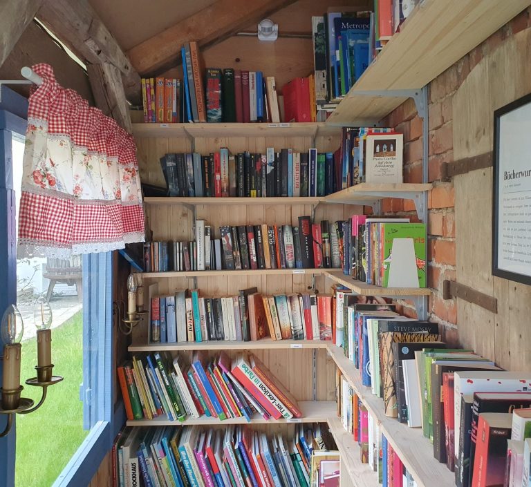 Wir schliffen, strichen, tauschten vom Holzwurm befallene Balken aus, legten einen festen Boden und Elektrizität in den kleinen Raum. Ein Vorhang, passende Lämpchen und eine kleine Lesebank zogen ein. An den Wänden befestigten wir ein Regalsystem, sortierten die Bücher nach Kategorien. So ist ein ganz besonderer Ort entstanden: offen für alle, die Bücher lieben.